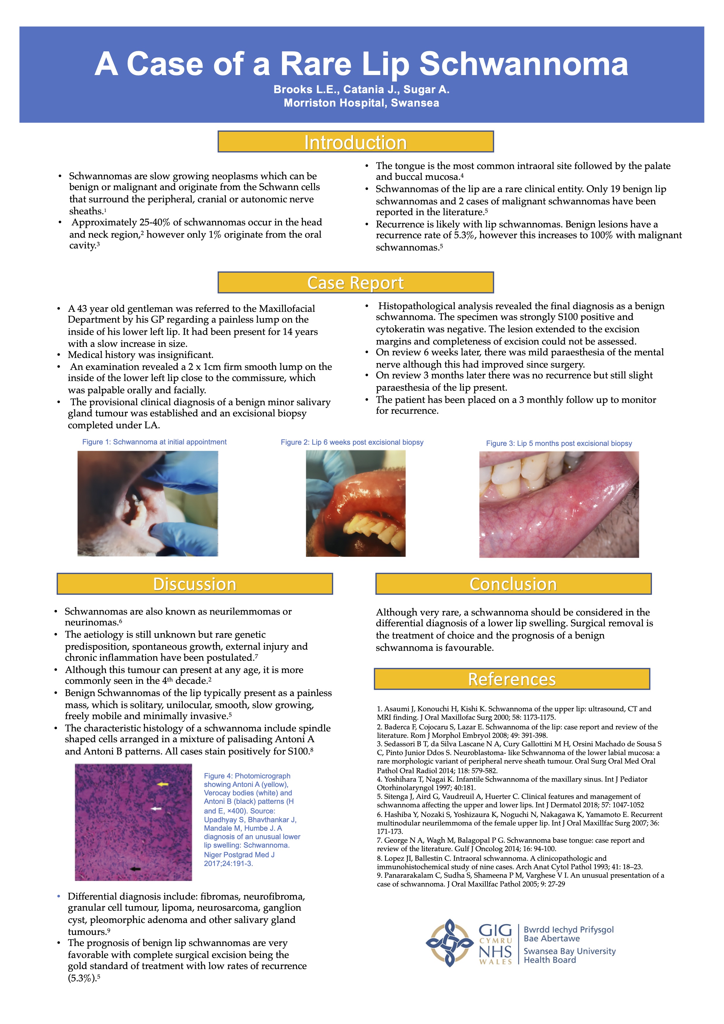 Introduction: Schwannomas are slow growing neoplasms which can be benign or malignant and originate from the Schwann cells that surround the peripheral, cranial or autonomic nerve sheaths. Approximately 25-40% of schwannomas occur in the head and neck region, however only 1% originate from the oral cavity. The tongue is the most common intraoral site followed by the palate and buccal mucosa. Schwannomas of the lip are a rare clinical entity. Only 19 benign lip schwannomas and 2 cases of malignant schwannomas have been reported in the literature. Recurrence is likely with lip schwannomas. Benign lesions have a recurrence rate of 5.3%, however this increases to 100% with malignant schwannomas. Case report: This case describes a 43 year old gentleman, who was referred to the Maxillofacial Department by his GP regarding a painless lump on the inside of his lower left lip. It had been present for 14 years with a slow increase in size. An examination revealed a 2 x 2cm firm smooth lump, which was palpable orally and facially. The provisional clinical diagnosis of a benign minor salivary gland tumour was established and an excisional biopsy completed. Histopathological analysis revealed the final diagnosis as a benign schwannoma. On review 6 weeks later, there was mild paraesthesia of the mental nerve although this had improved since surgery. He is on a 3 monthly follow up to monitor for recurrence. Conclusion: Although very rare, a schwannoma should be considered in the differential diagnosis of a lower lip swelling. Surgical removal is the treatment of choice and the prognosis of a benign schwannoma is favourable.